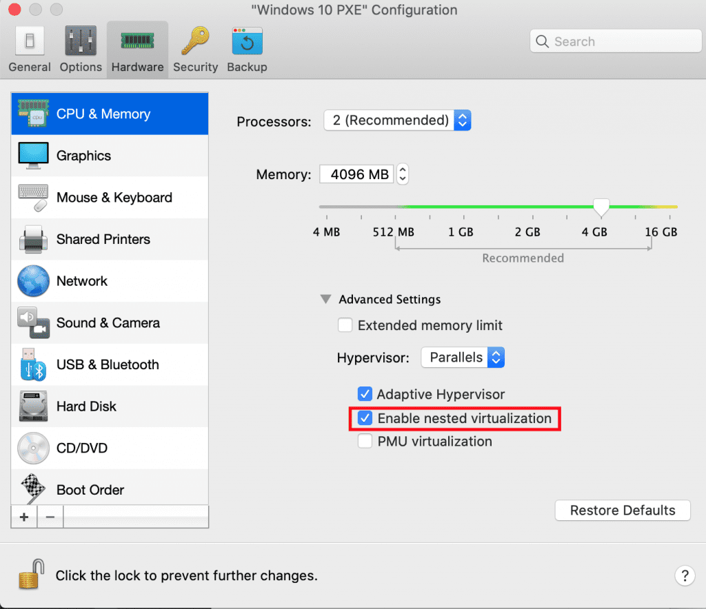 Both administrators and users can activate Hyper-V in Parallels Desktop Business Edition. The corresponding option can be found as a checkbox under “CPU & RAM” labeled as “Enable nested virtualization.” This will allow a Parallels Desktop Business Edition virtual machine to execute its own virtualization, such as Hyper-V. As a result, organizations can make Hyper-V applications available to Mac users as well.