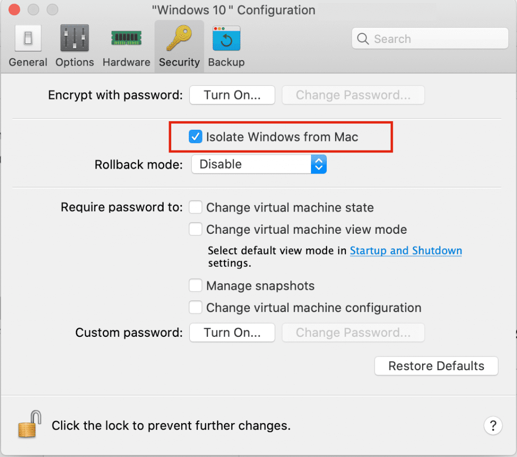 Parallels Desktop™ for Mac Business Edition offers the option to turn off part of its convenience functionality, resulting in enhanced sandbox safety. The “Isolate Windows from Mac” option, found under the “Safety” options, makes it so the guest system will not have direct access to any of the device’s hardware features. File synchronization is also deactivated. This prevents malware from “crossing over” to the host system and doing damage beyond the boundaries of the virtual machine. This can be the best way to go for VMs used for development and testing.