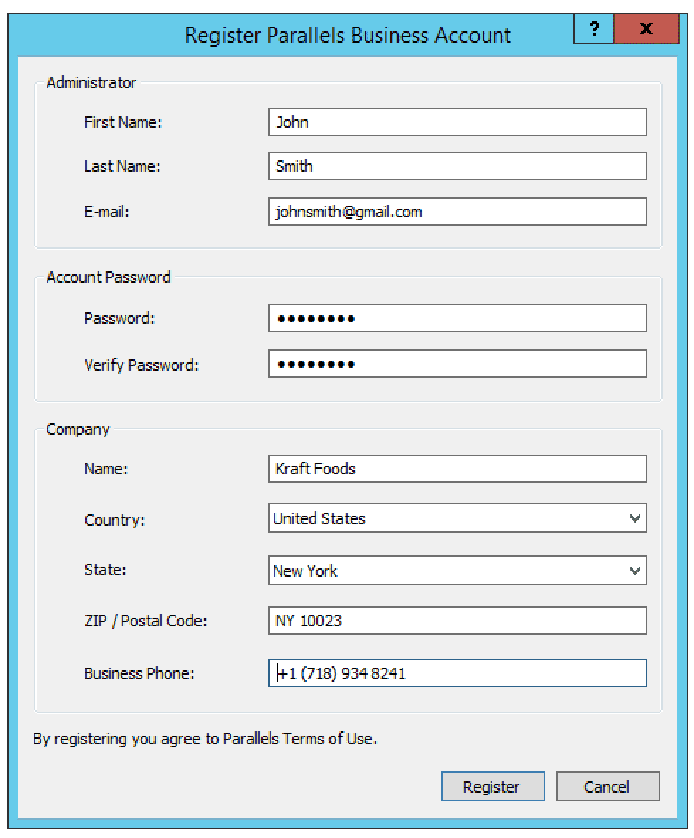 2. When the dialogue box above appears, insert your details and click on the Register button to create your account. If all the details are entered correctly, a prompt stating your account has been successfully registered will be shown. You will then be taken back to enter your Parallels Business Account credentials as described in Step 1.