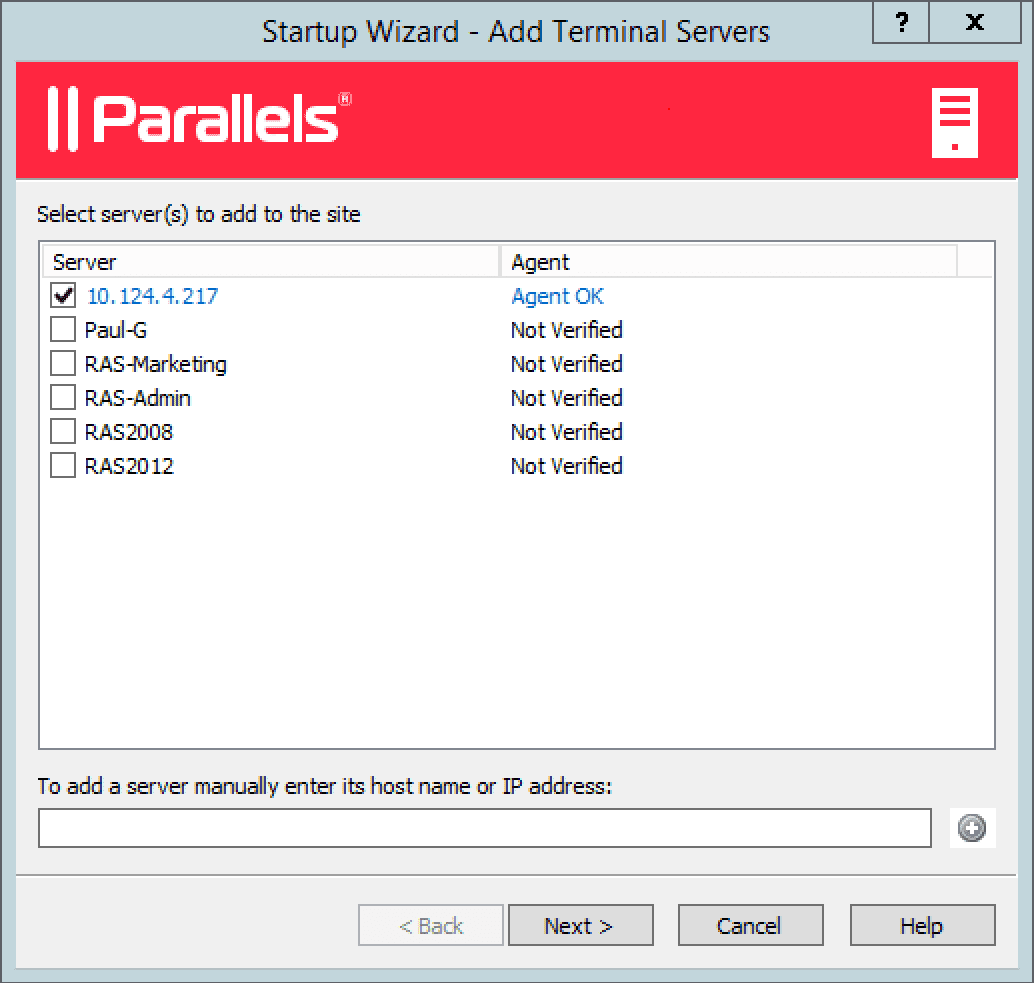 2.The first dialogue box shows a list of current servers from the Active Directory. Select the server or multiple terminal servers on which the Terminal Server Agent will be installed by clicking on the checkbox to the left of the name. Alternatively, if the server does not show up in the list, add an IP/ hostname manually in the textbox below and click the + Click Next to continue.