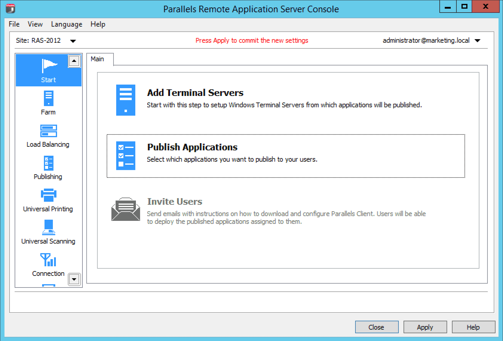 Once your license key has been activated, you can familiarize yourself with the Parallels Remote Application Server interface. At this stage, you may enable the RDS/ TS role on the server on which Parallels Remote Application Server is installed, or add a new server designated for terminal access.