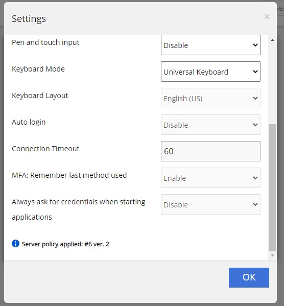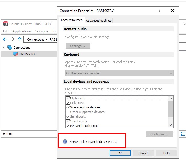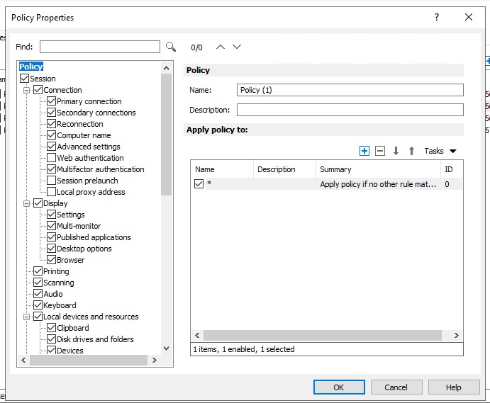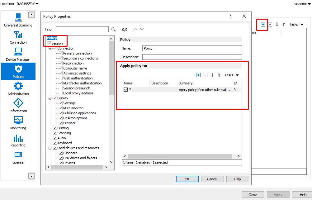 The Policies category allows you to manage Parallels Client policies for users connecting to a Farm. By adding client policies, you can group users and push different Parallels Client settings to user devices forcing them to function as your organization requires.  Settings that can be enforced on user devices include RAS connection properties, display, printing, scanning, audio, keyboard, device, and others. Once you create a policy and push it to a client device, the user of the device cannot modify the settings that the policy enforces. In Parallels Client this will manifest itself as hidden or disabled connection properties and global preferences.