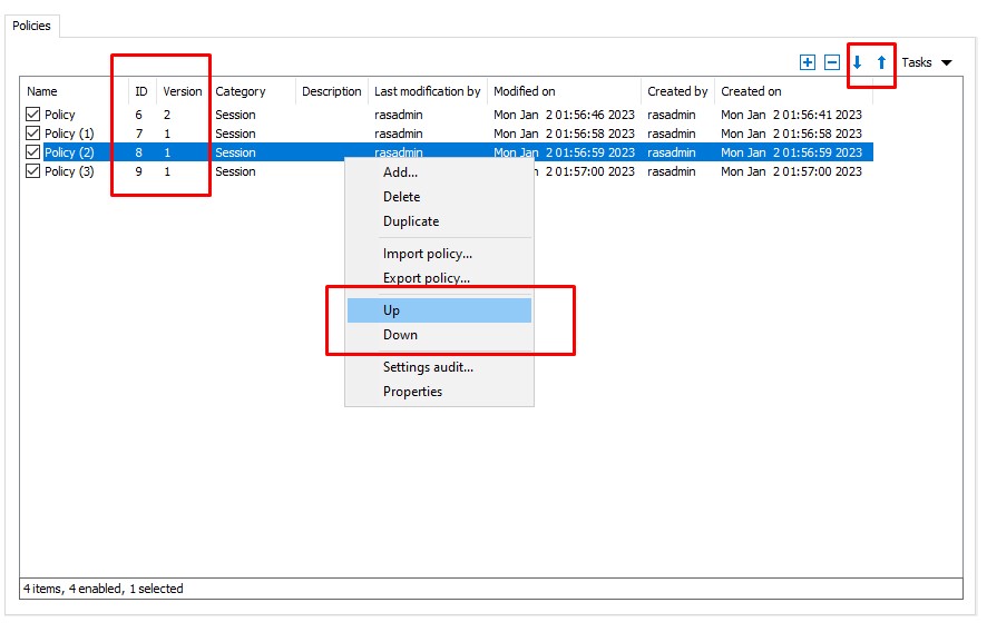 You can move policies in the list by using arrow icons or *right-click* on Policy > Up and Down accordinely. The Policy ID and Version are specified in the RAS Console
