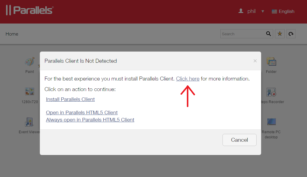 When this option is configured on the server-side, you will see a dialog box prompting you to install Parallels Client. Click the link provided to open the Parallels Client download and installation page and follow the instructions. After you install Parallels Client, the main Parallels HTML5 Client screen opens displaying published resources that you can use. If you now double-click or tap a resource, it will be launched in Parallels Client.