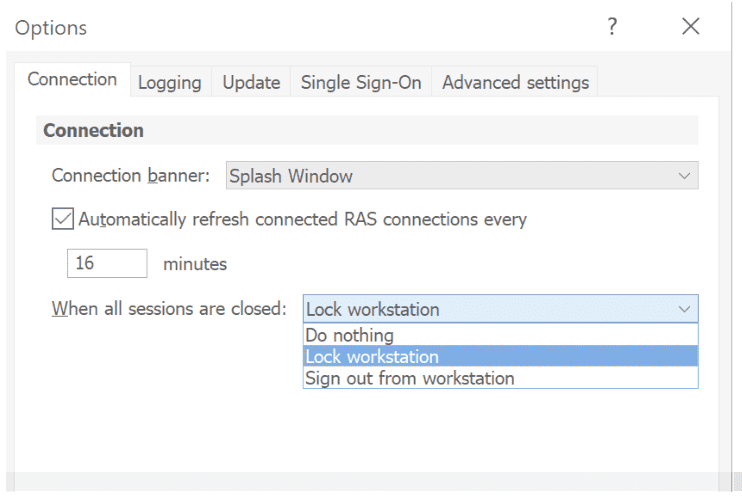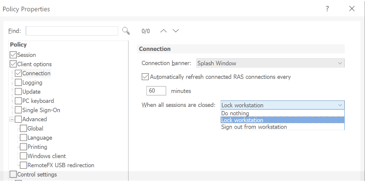 This feature can be set directly within the Parallels Client for Windows settings or centrally controlled and customized through policies within Parallels RAS management console. System administrators can define the desired behavior, such as specifying whether the workstation should be automatically locked or signed out.
