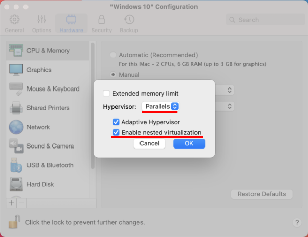 2. Open the virtual machine configuration > Hardware > CPU & Memory, click Advanced, and set the hypervisor to Parallels. After that, tick the Enable nested virtualization checkbox.