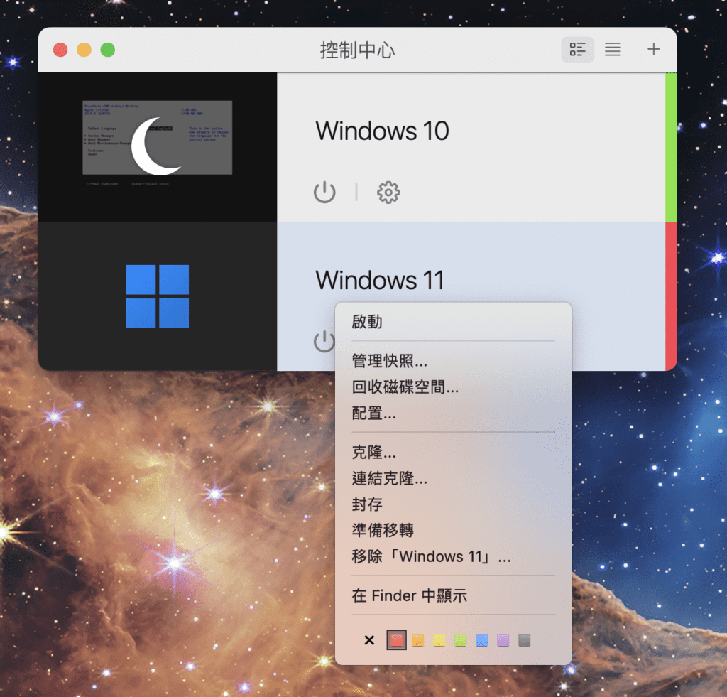 如果您希望能更好区分 Windows 和 macOS 程序坞图标,您可以在控制中心用颜色标记虚拟机: