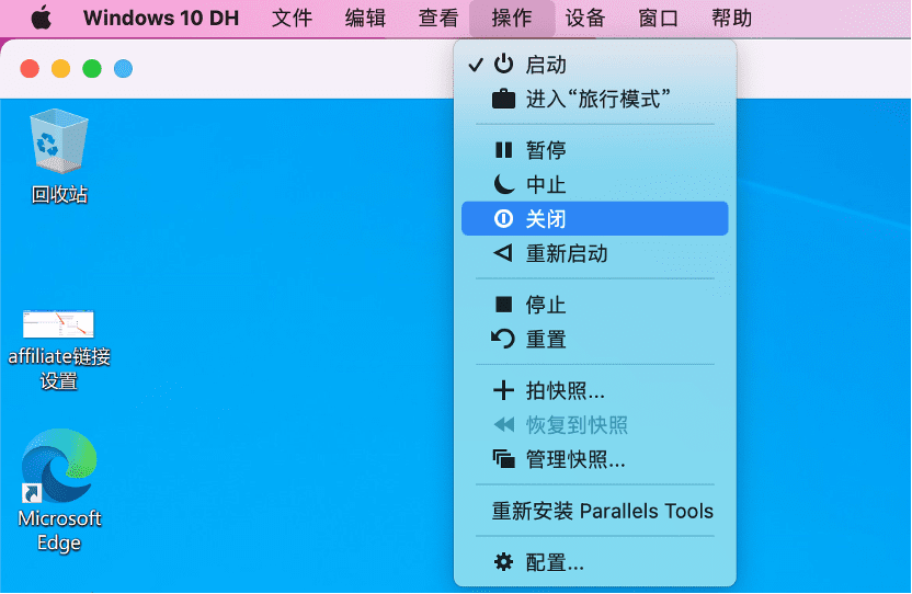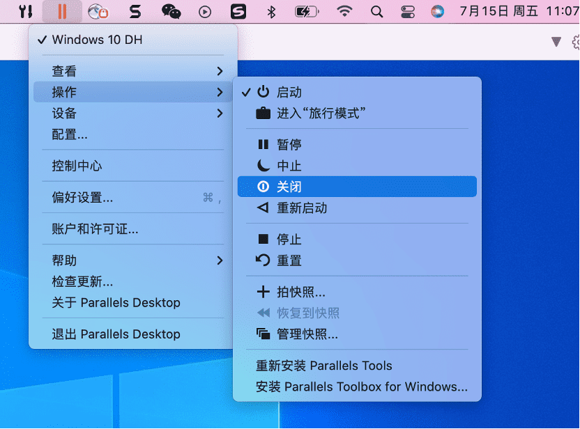 - 单击菜单栏中的Parallels图标,然后选择“操作”>“关闭”。