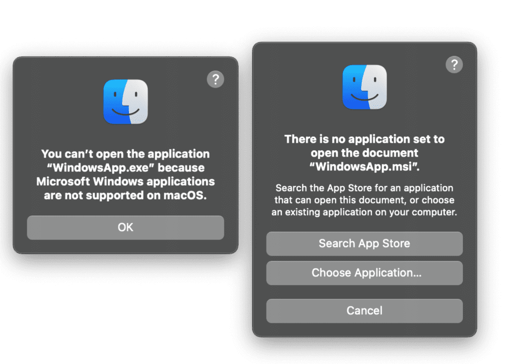 许多 Windows 应用程序使用名称以 .msi 和 .exe 扩展名结尾,这些文件类型专为在 Windows 上启动和安装而设计,如果没有其他工具协助则无法在 Mac 上打开。如果您尝试在 Mac 上启动此类文件,您将收到一条错误消息,内容为“您无法打开应用程序“{filename}.exe”,因为 macOS 不支持 Microsoft Windows 应用程序。”或“没有应用程序设置为打开文档“{filename}.msi”。”