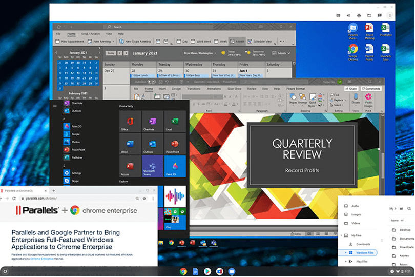 - 同时运行多种功能完备的 Windows 应用和 Chrome OS 应用:直接在企业版 Chromebook 上运行 Microsoft Office 和其他功能完备的 Windows 应用。在使用 Chrome OS 应用的同时,可轻松地在 Excel 中向图表添加趋势线、在 Word 中添加目录以及在 PowerPoint 中添加自定义字体或页眉和页脚(这些功能在其他版本的 Microsoft Office 中不可用)。无需重新启动或使用不稳定的仿真器。