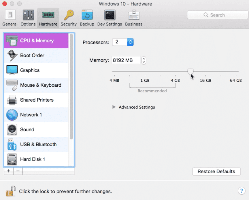 为VM使用多个核心:虽然Parallels Desktop现在默认为新VM的设置两个处理器,但如果在此设置为默认值之前创建了VM,则VM可能只使用一个核心。可将此设置更改为两个或四个核心以提高性能。