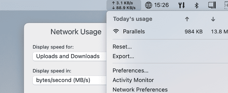 这个新工具通过在菜单栏 (Mac) 或桌面上的浮动面板 (Windows) 中显示当前的下载和上传速度来跟踪运行时的网络使用情况。此信息也通过工具图标包含在 Parallels Toolbox 代理中。
