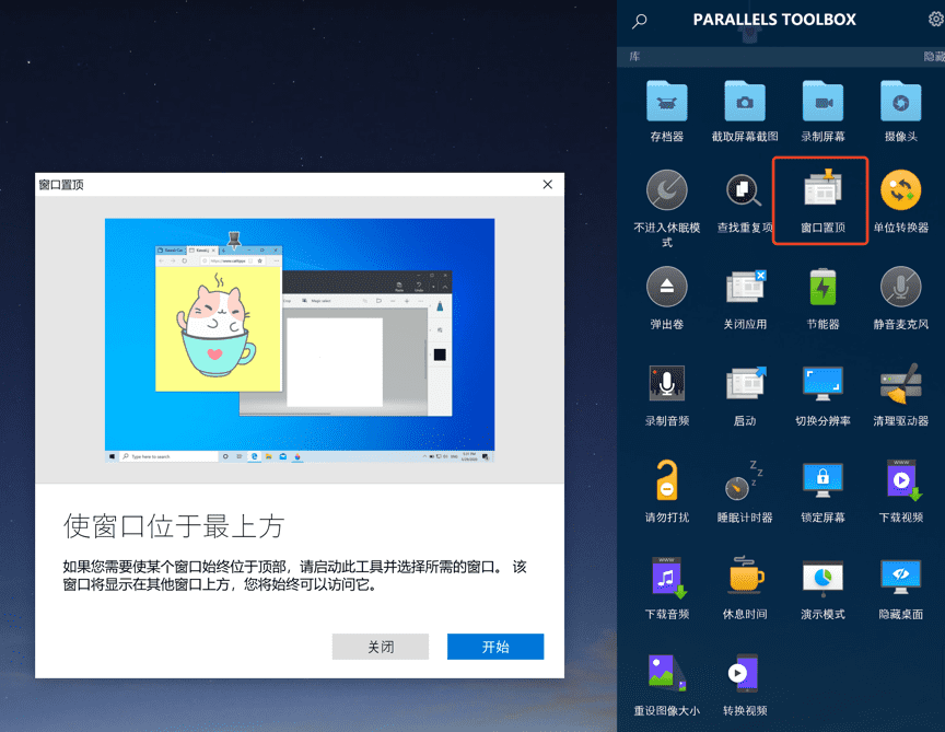 使用 Parallels Toolbox 一键式工具“窗口置顶”在 Windows 10 中固定应用窗口