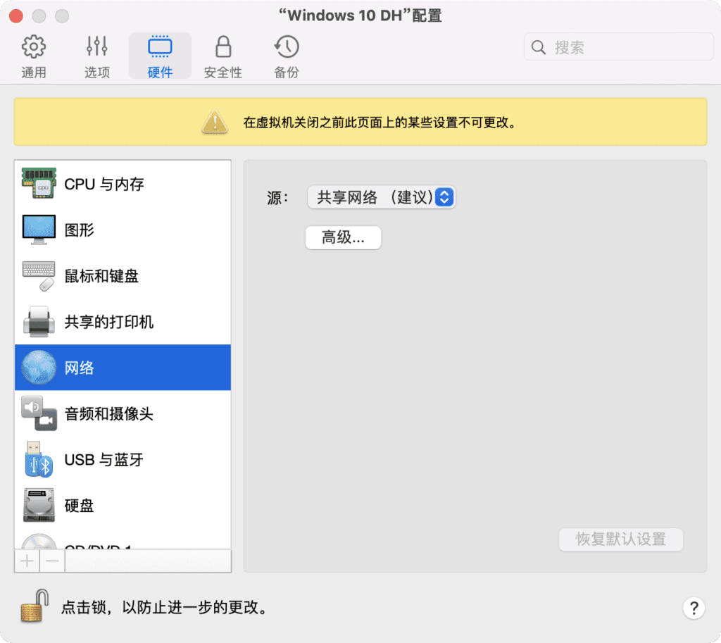 转到虚拟机的“配置”>“硬件”>“网络”>“源”,“共享网络(建议)”选项应默认已设置。如果您已经设置了“共享网络”,但在 Windows 中仍然遇到网络问题,请将其切换到“桥接网络:默认适配器”,并验证在这些模式下能否正常使用 网络。