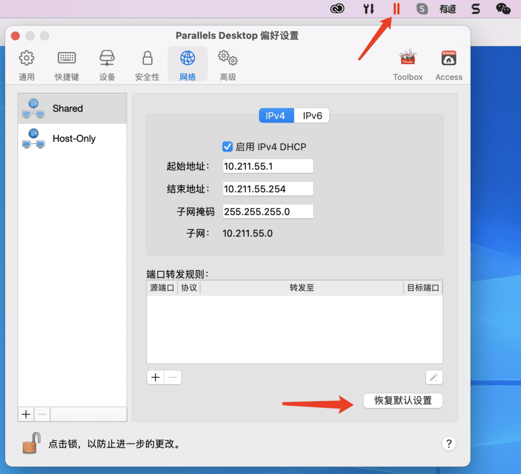 Mac 顶部任务 >“偏好设置”>“网络”>“恢复默认值”,重置整个 Parallels Desktop 应用程序的预设网络设置。
