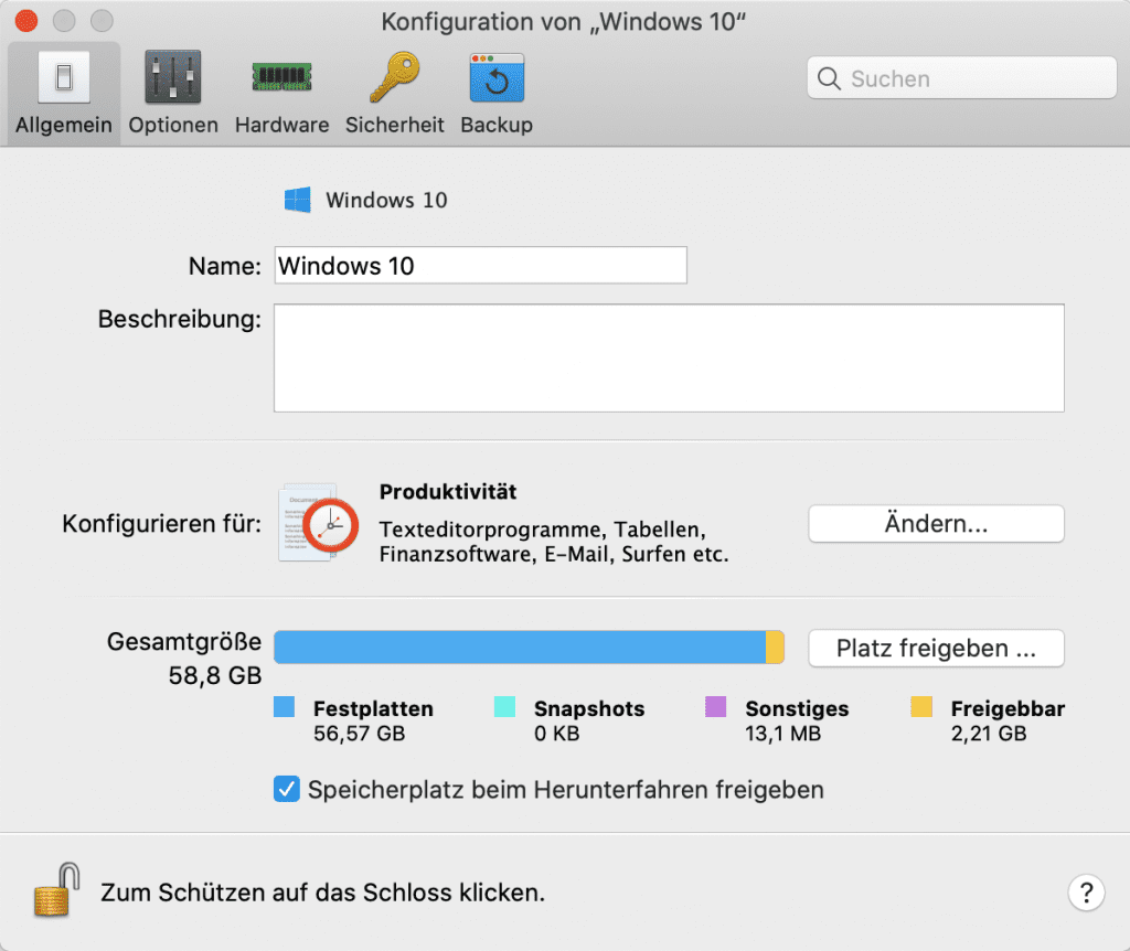 - 10 % der Parallels Desktop-Benutzer haben zu wenig verfügbaren Festplattenspeicherplatz. Wir haben eine Funktion integriert, die dir dabei hilft, den Speicherplatz besser zu verwalten, mit der Option, verfügbaren Speicherplatz automatisch für den Mac freizugeben.