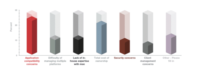 Ein weiterer häufig genannter Grund ist der Kostenfaktor. Die Verantwortlichen fürchten, mit Apple-Hardware insgesamt höhere IT-Kosten tragen zu müssen. 21,3 Prozent glauben, mit Macs im Unternehmen eine höhere TCO, also „Total Cost of Ownership“, in Kauf nehmen zu müssen. Darin sind alle Kosten enthalten, von der Anschaffung, dem Betrieb und dem Wertverlust der Geräte. Zusätzliche externe Kosten wie Extra-Lizenzen für Software auf alternativen Betriebssystemen und zusätzlicher Supportaufwand fallen ebenfalls mit in diese Berechnung.