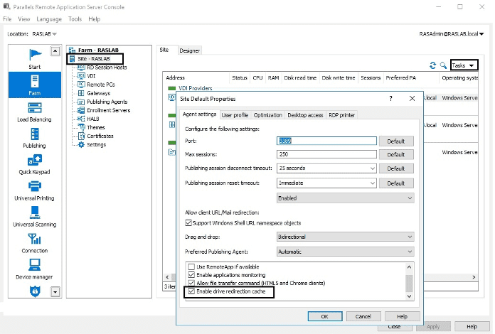 - Wenn Sie RDSH überprüfen möchten, wählen Sie RD-Sitzungshosts. Wähle dann Agent-Einstellungen. Aktiviere im Fenster „Standardeinstellungen der Site“ das Kästchen neben „Cache für Laufwerksumleitung aktivieren“, das sich ganz unten befindet.