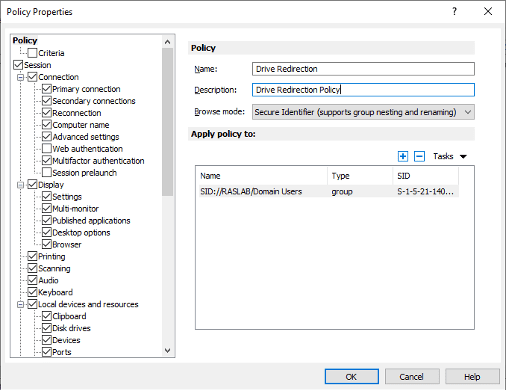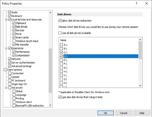 Die Funktion zur beschleunigten Dateiübertragung setzt voraus, dass die Laufwerksumleitung in der Benutzersitzung aktiviert ist. Dies kann über die RAS-Richtlinien von Parallels konfiguriert werden: