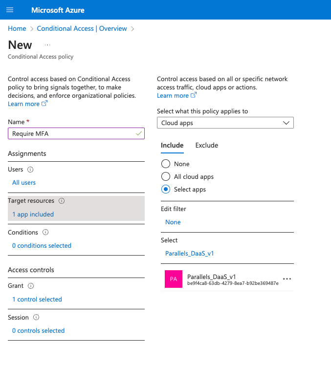Set Target resources to include your Parallels DaaS app registration (or all cloud apps) and exclude Azure Windows VM Sign-In.