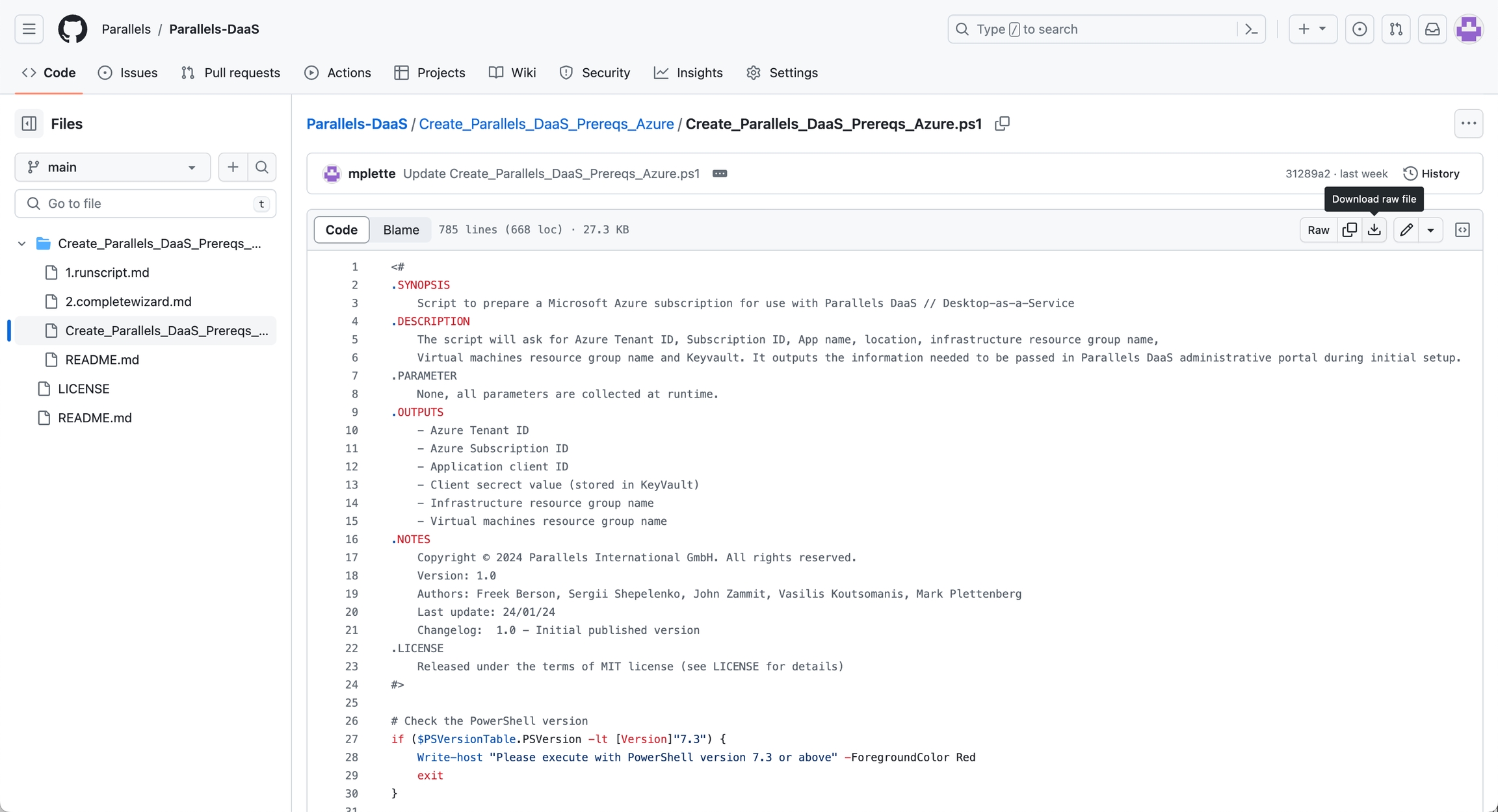 Create_Parallels_DaaS_Prereqs_Azure.ps1file.Click the Download raw file button.