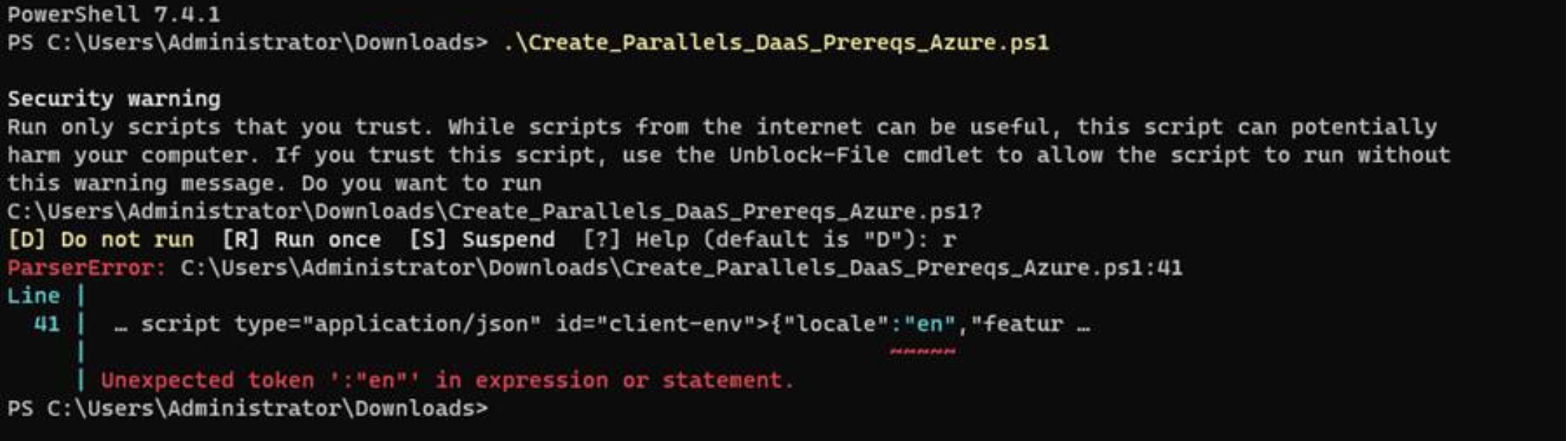 When trying to run the prerequisites PowerShell script a ParserError error is shown on line 41.