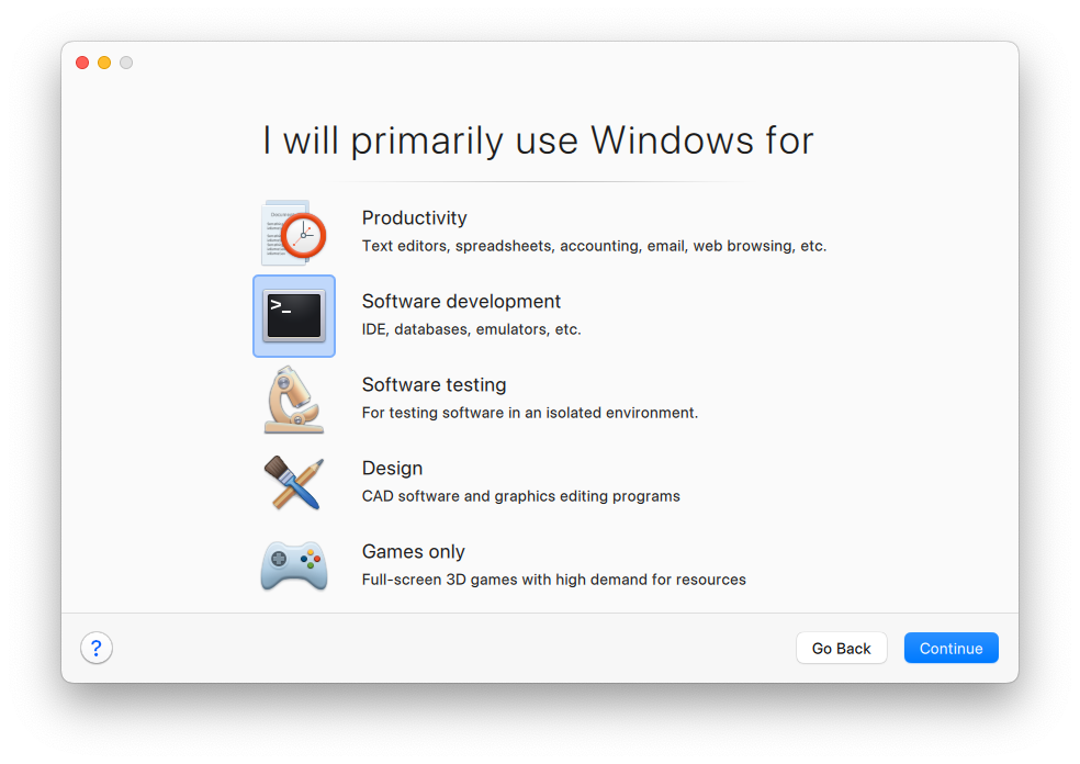 When creating a virtual machine in Parallels Desktop Pro or Business Edition, the setup process includes a page where you can choose the primary use case, like software development or software testing.