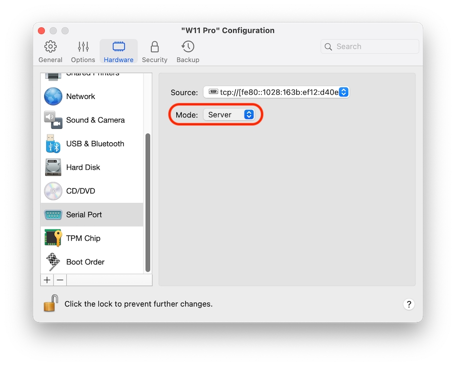 Serial over TCP can be used for remote debugging of VMs. You will need to set up your VM as a Server if you want to debug it or as a Client if you want to use it to debug other machines. Begin by choosing New Socket from the Source drop-down menu and type in tcp://0.0.0.0:2020 for the Server role or tcp://127.0.0.1:2020 for the Client role. Use the Mode drop-down menu to choose the appropriate role. IPv6 is also supported, so you can set up the Server as tcp://[::]:2020 and the Client as tcp://[fe80::1023:163b:ef12:d40e%eth0]:2020.