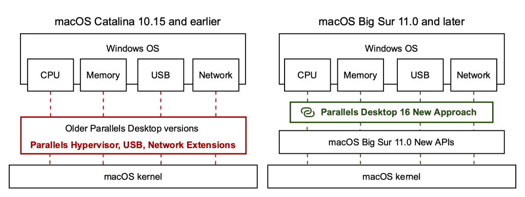 以下のスキームでは、対応する macOS バージョンにおける Parallels Desktop のデフォルト モードの違いを視覚的に説明しています。Parallels システム機能拡張を使用した従来の Parallels Desktop での設計を左側に、macOS Big Sur API を採用した Parallels Desktop 16 の新しい概念を右側に示しています。