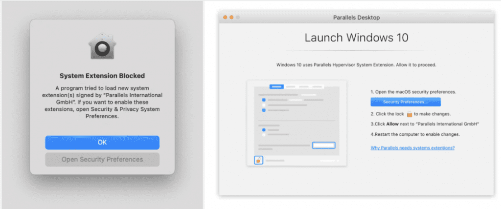 - Parallels Desktop が Parallels ハイパーバイザーのシステム機能拡張を読み込もうとすると、macOS はユーザーにこれを「許可」するよう促します。システム機能拡張には管理者特権が付与されているため、信頼できないソースの場合、悪意を持って使用される可能性があります。つまり、これはセキュリティ上の予防措置であり、スマートフォンのアプリケーションがカメラへのアクセスを要求する仕組みと似ています。