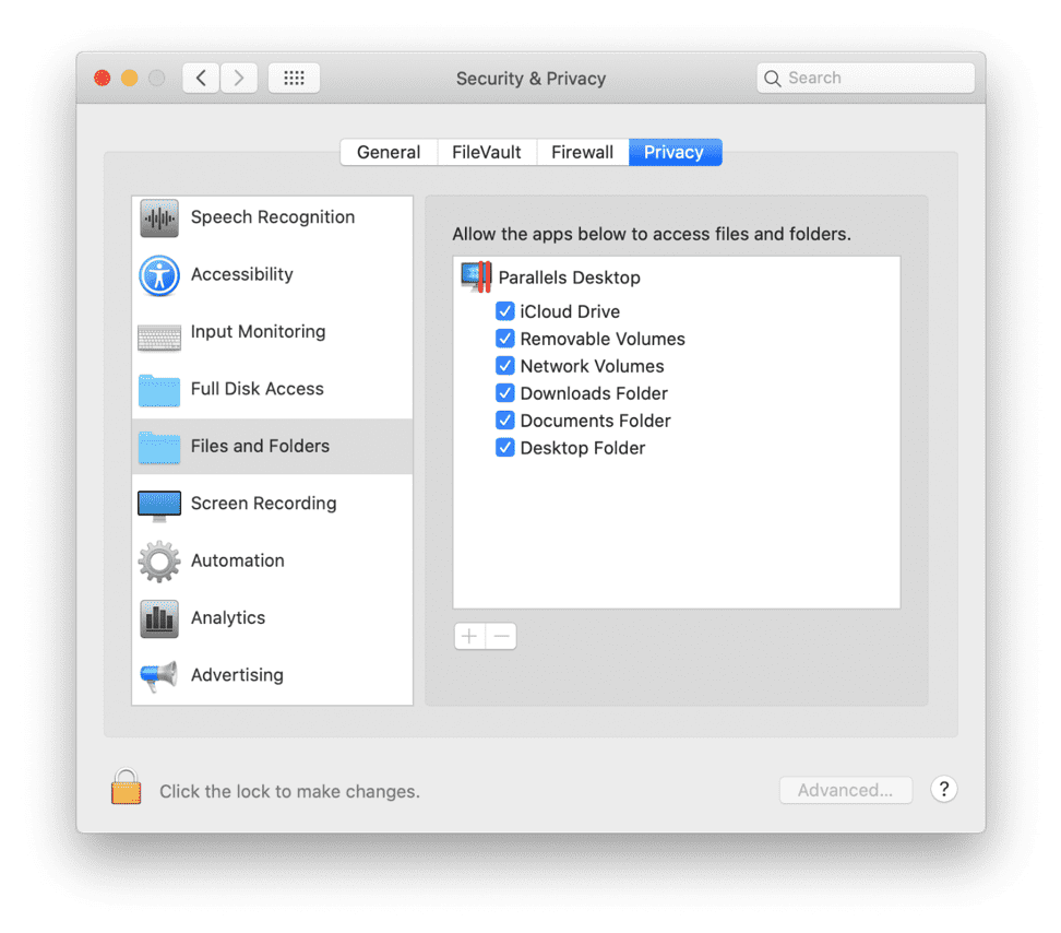 - フォルダにある Parallels 仮想マシンとファイルを引き続き使用できるようにするため。外部のネットワーク ストレージにある仮想マシンを引き続き使用する場合、Parallels Desktop からこのようなロケーションに対するアクセスも求められる可能性があります。