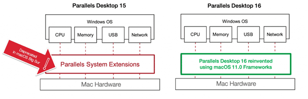 この macOS の変更に伴い、Parallels Desktop アーキテクチャに再構築が必要になった訳です (図 2 参照)。