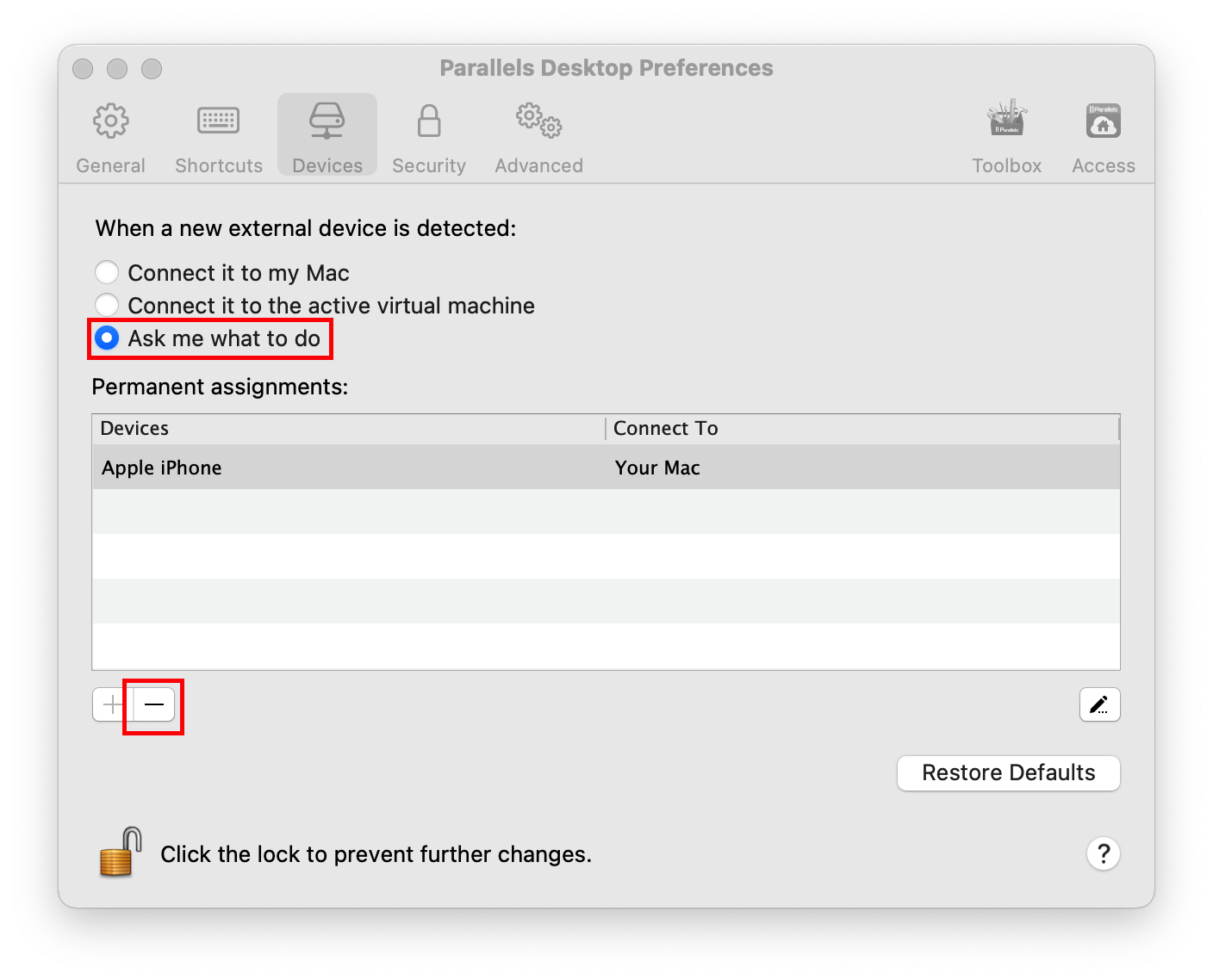 • Check whether the device you would like to connect to your virtual machine is listed under Permanent Assignments list. Use "-" button to delete the device from the list.