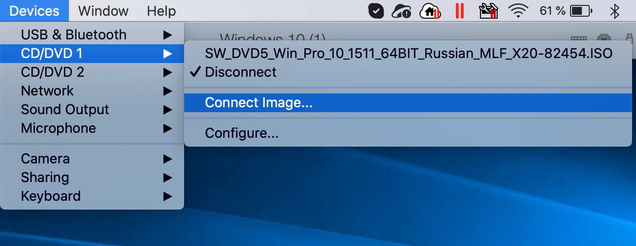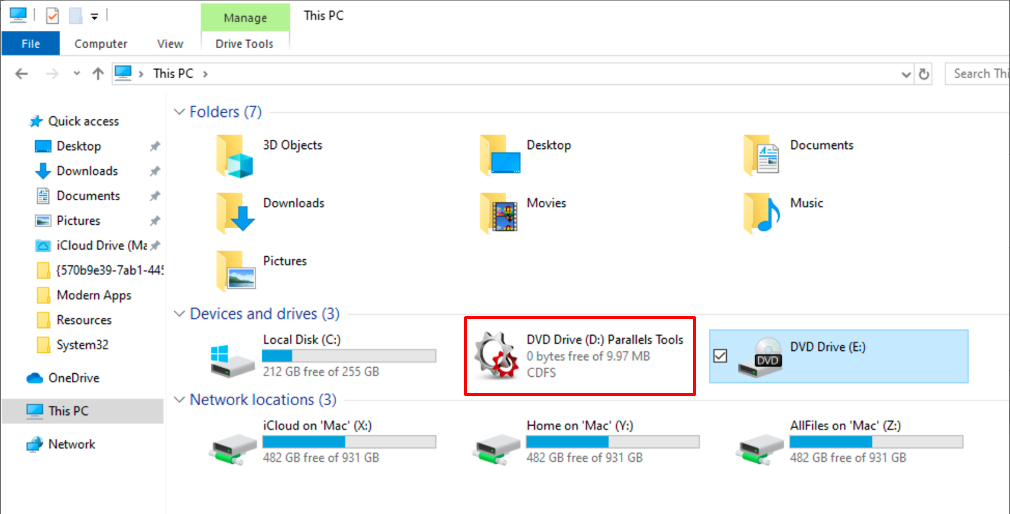 If the Parallels Tools disk image file is not mounted inside the virtual machine, meaning you cannot see the Parallels Tools CD in Windows Explorer under This PC - follow these steps: