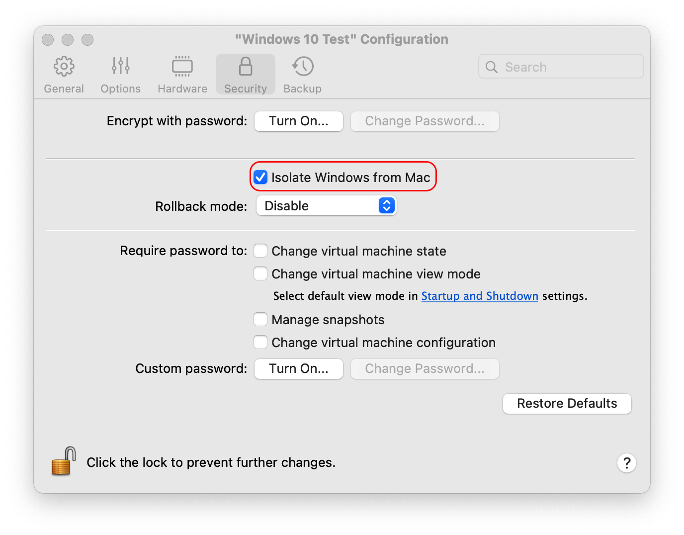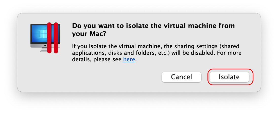 When a virtual machine is isolated from macOS, folders, profiles, applications, and external drives are not shared between two operating systems. In general, it becomes impossible to copy a file from one operating system to another. Isolating a virtual machine provides the highest level of security by not allowing possibly compromised items from one operating system to come into contact with the other.