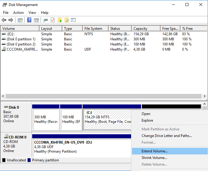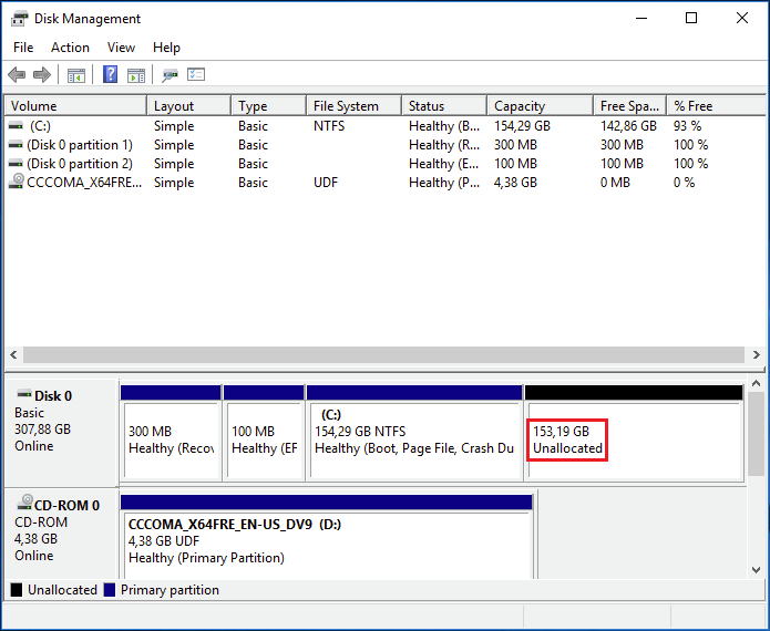 Disk Management will report that you now have an extra partition on the hard drive that’s marked as Unallocated. You can add this Unallocated partition manually to your main disk (C:) partition: