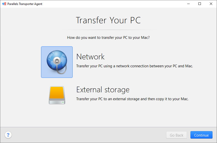 Run the Parallels Transporter Agent and once asked, choose the desired method for importing the data from your PC to your Mac.