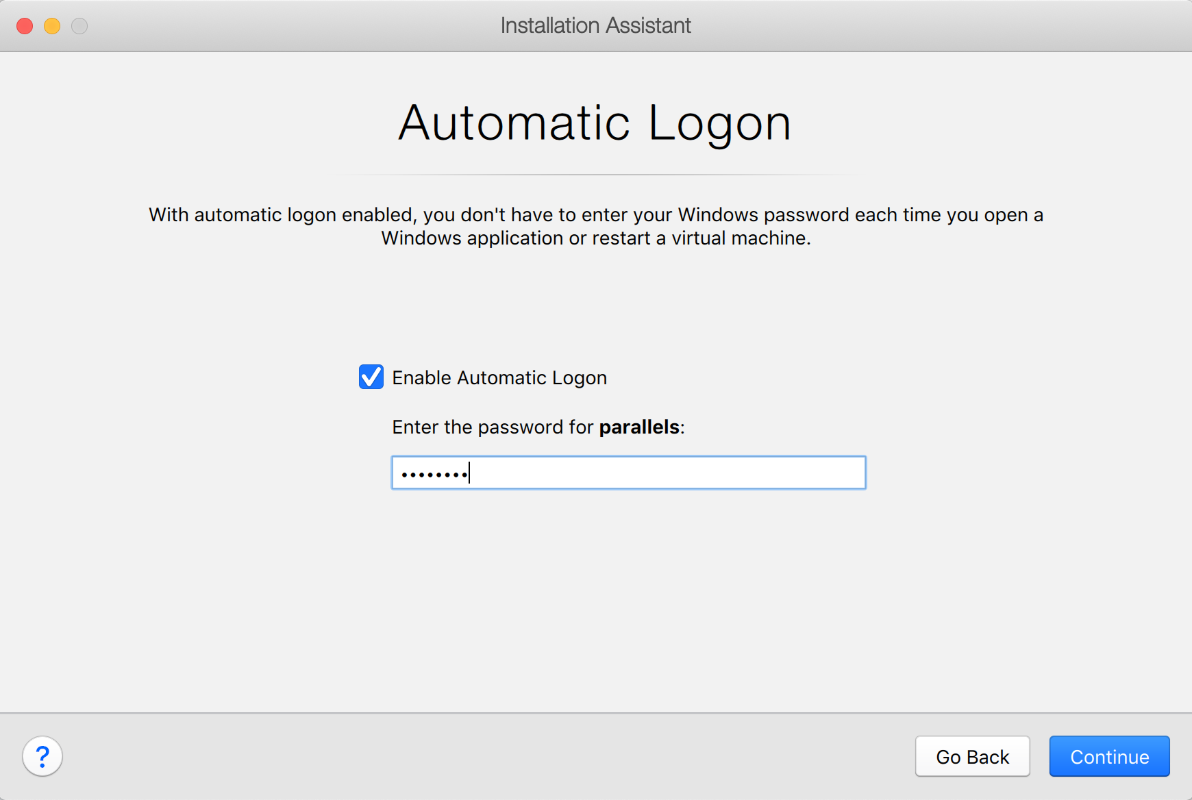 If you want to log in to Windows automatically whenever you start up, tick the option Enable Automatic Logon and enter the password from your account on Windows. Then click Continue.