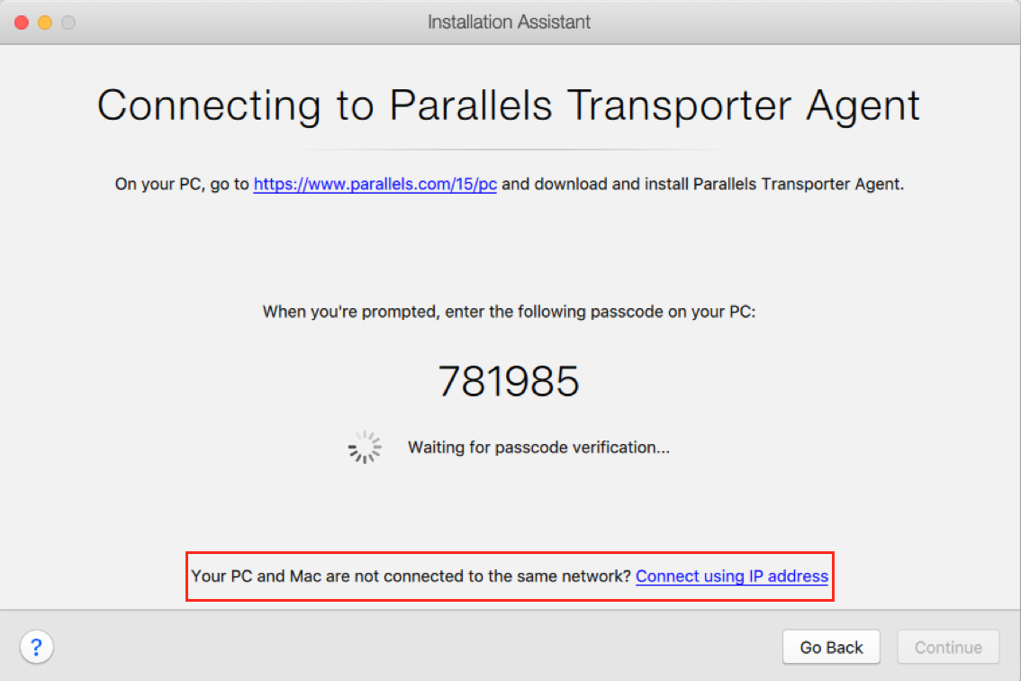 Find the passcode displayed in the Parallels Wizard on your Mac and enter it in the Parallels Transporter Agent on your Windows PC. You can also connect to the source Windows PC using its name or IP address: click Connect using IP address, select the Windows PC name from the list or type the IP address, and click Continue.