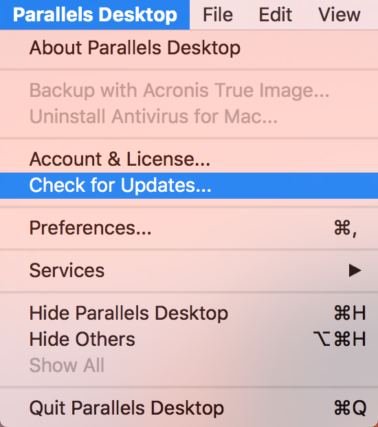 From the top menu bar, go to the Parallels Desktop menu, click Check for Updates.