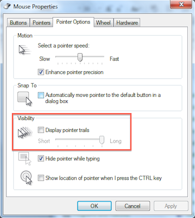 Make sure Display pointer trail is not enabled.