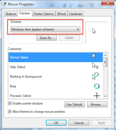 3. In Windows go to Start > Control Panel > Mouse > Pointers tab/Pointer Options tab.