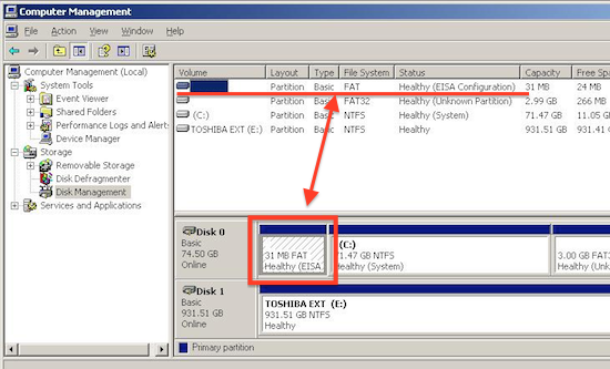 DISKPART select disk 0 list partitionChoose the partition that corresponds to EISA partition in Disk Management (in most cases it is "Partition 1") and execute commands in Command Prompt: