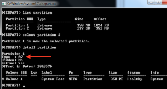 select partition 1 detail partitionCheck the output. If partition type is 12 or 27 it means it is a hidden partition. Parallels Transporter currently cannot migrate such partitions.