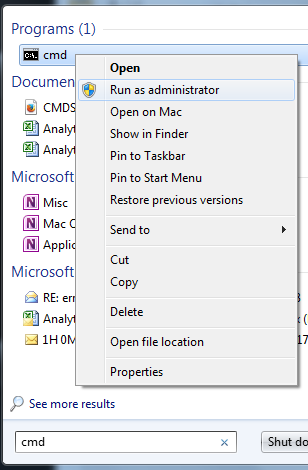 Go to Start. Type in the Search field cmd and then launch cmd application with administrative privileges (Right-click > Run as Administrator).