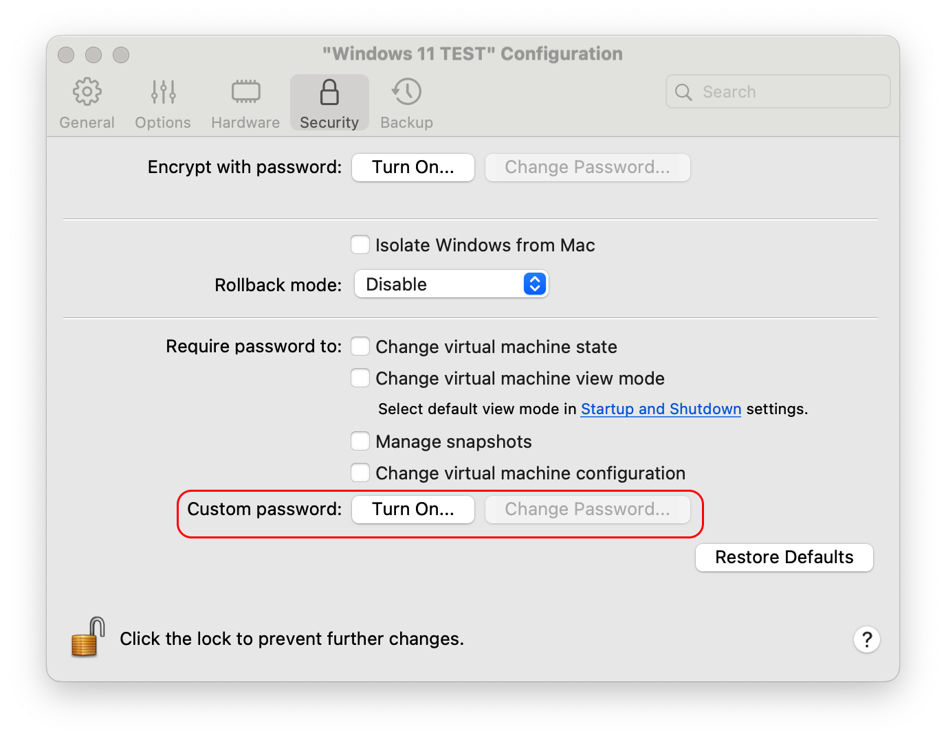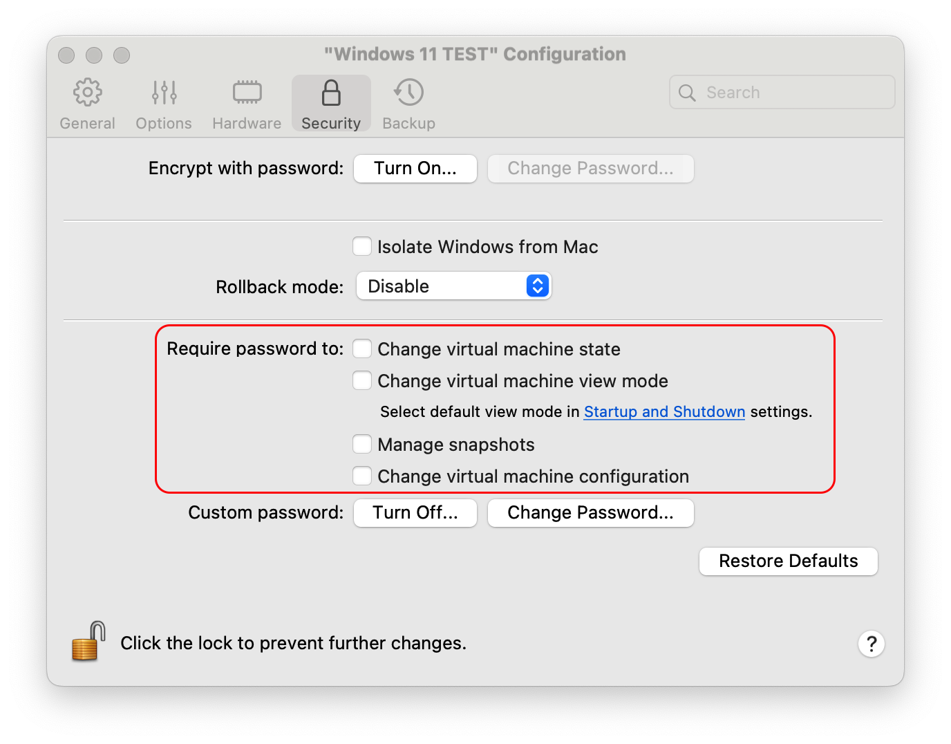 In Parallels Desktop, you have the option to apply password protection to the configuration settings of a virtual machine, thereby preventing unauthorized changes by Mac users.
