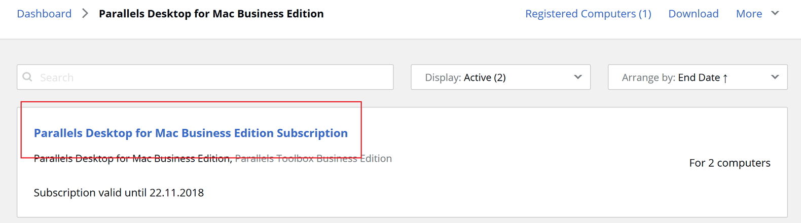 1. Sign to your Parallels account. Subscriptions on the Dashboard are divided by products. Click on Active subscriptions under one of the products to view the subscriptions list.