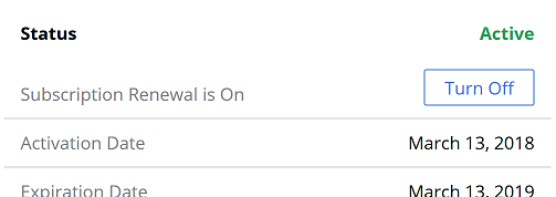 3. Manage auto-renewal by clicking on the Turn Off or Turn On button in the Status box.