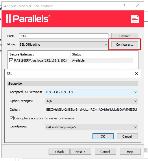 The SSL Offloading mode requires an SSL certificate to be assigned to HALB. When you select it, click Configure and specify the following: