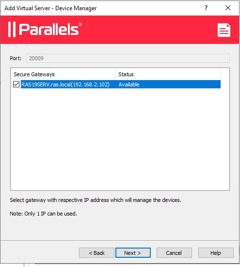 Configure Windows client device management, select a gateway that will manage Windows client devices. Note that only one IP address per gateway can be used.